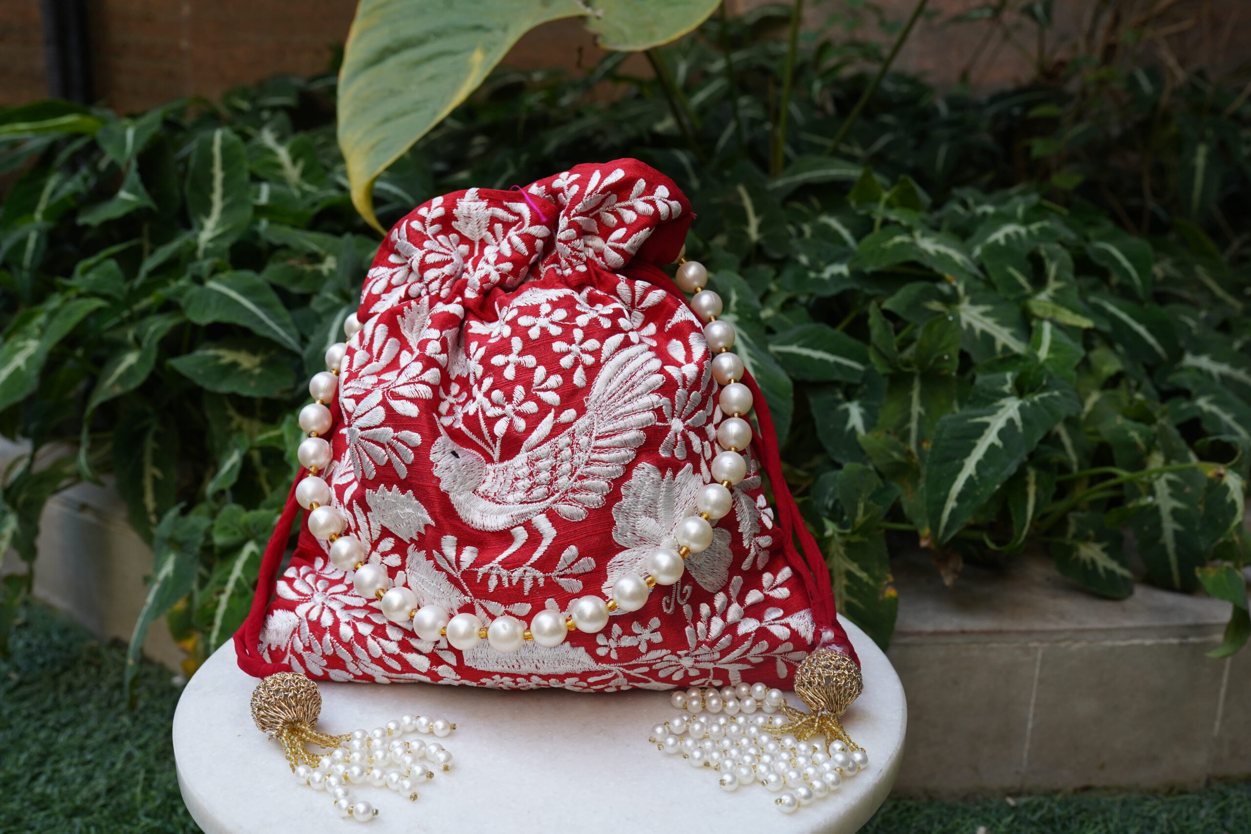 Festive Floral Brocade Potli Bags with Pearl Slings