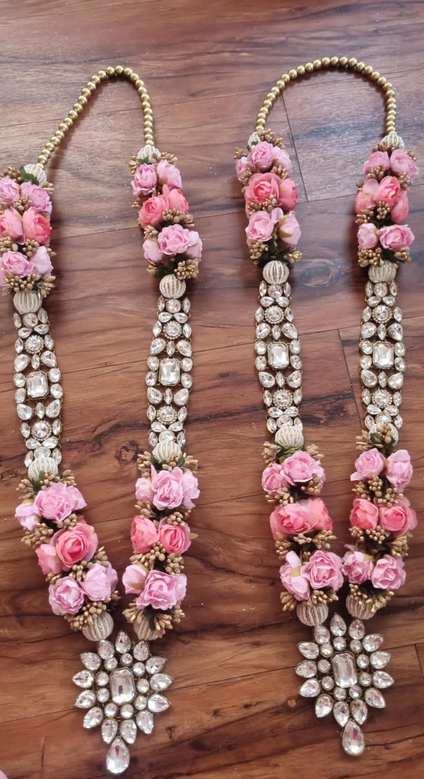 Red and baby pink artificial florals come together in this eye-catching varmala with layers of glimmering kundan work. The dual tones add vibrancy, while the intricate design ensures a royal vibe for any ceremony