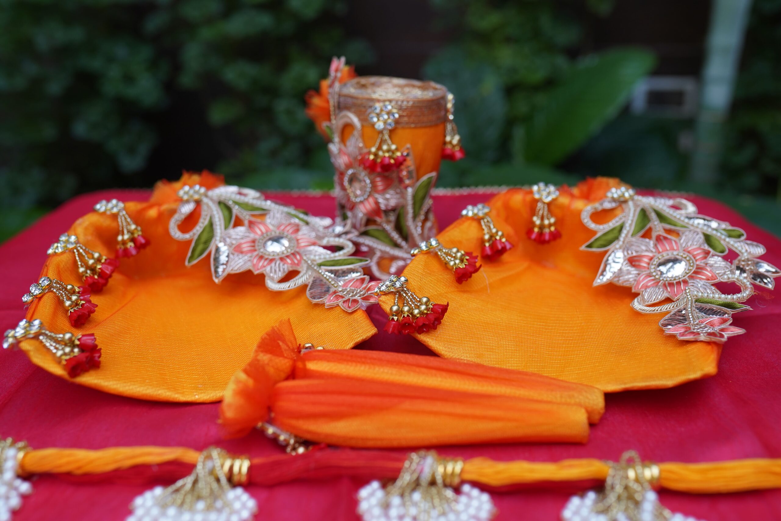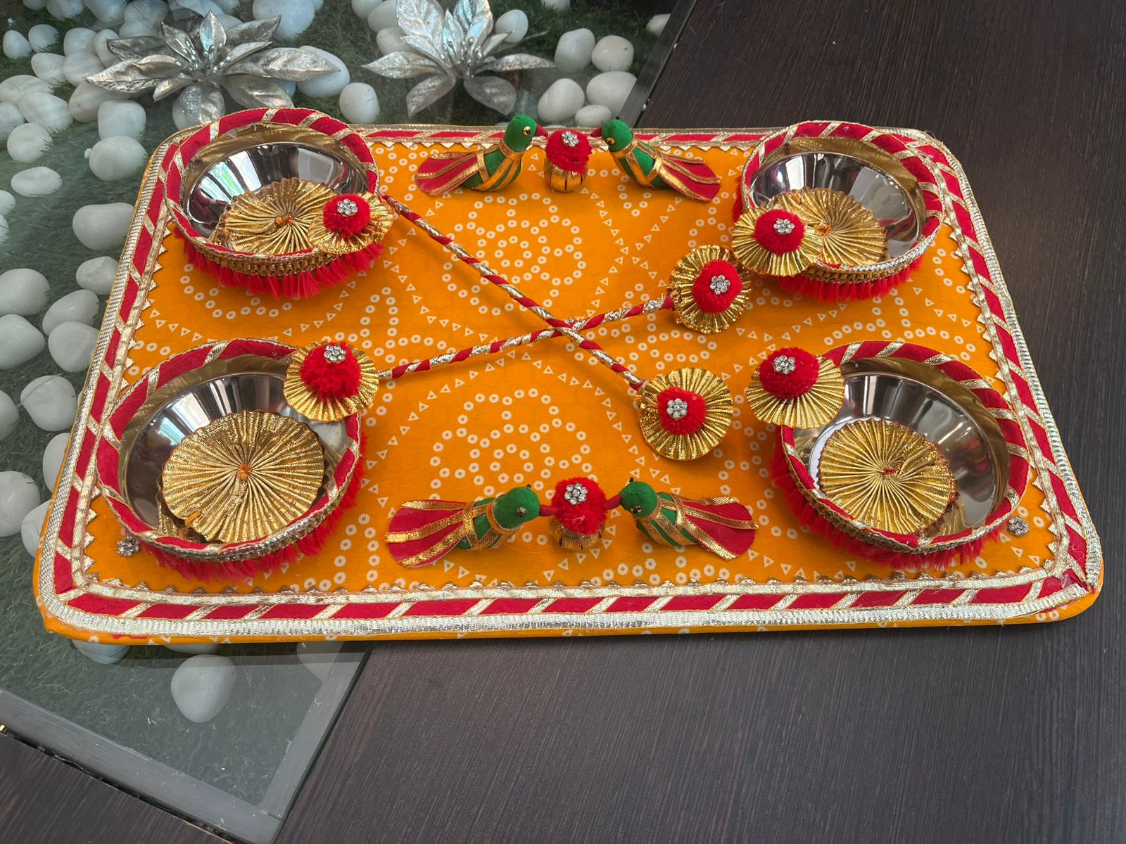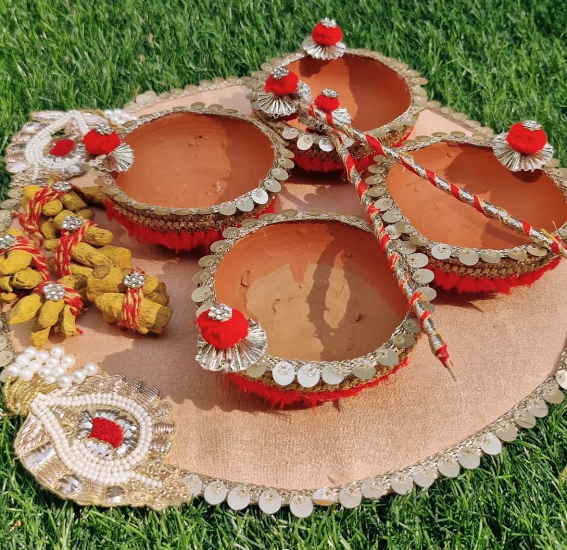 Simple, serene, and full of tradition — this Haldi & Mehendi Thali is crafted on a soft gold fabric base and decorated with red-gold latkans, sequins, pearl lace, and floral accents. It comes with four earthy terracotta bowls, perfect for holding haldi, mehendi, kumkum, or rose petals. A must-have for every bride’s ritual collection.