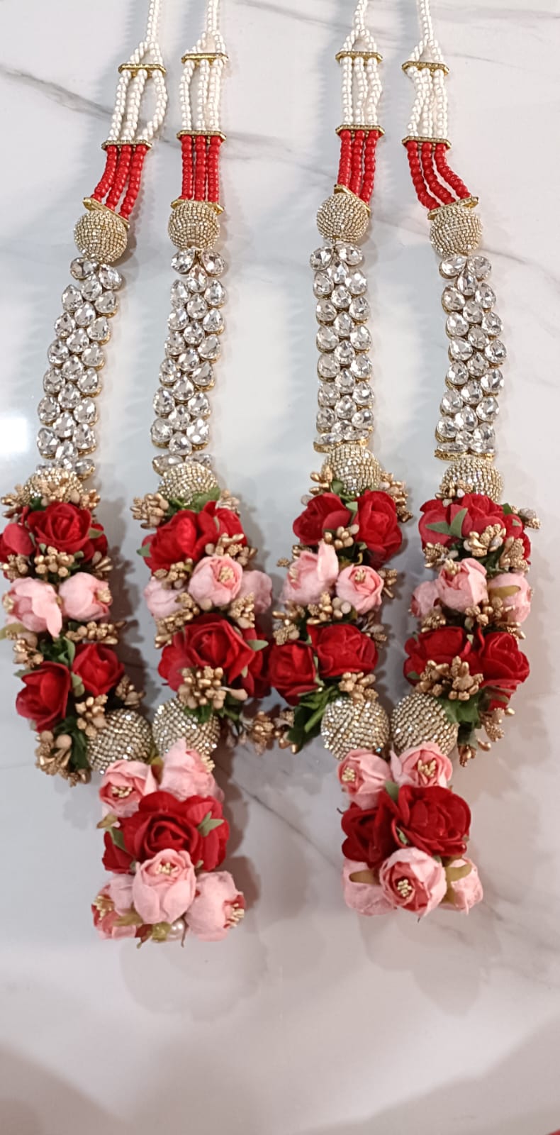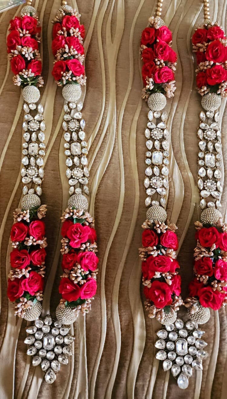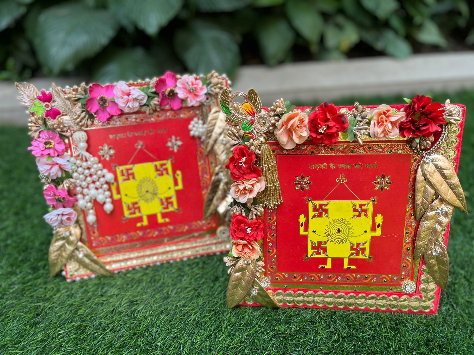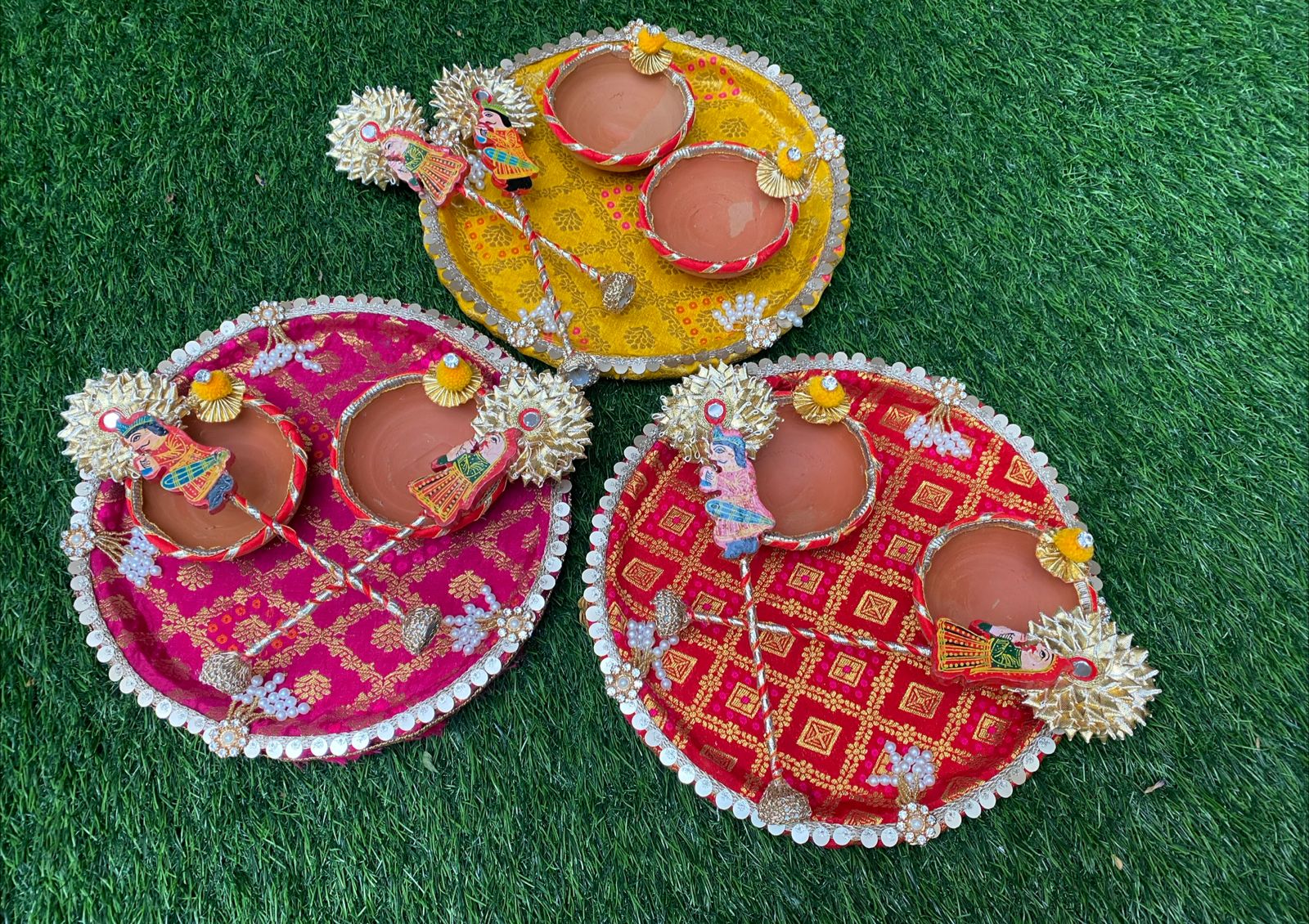 Simple, serene, and full of tradition — this Haldi & Mehendi Thali is crafted on a soft gold fabric base and decorated with red-gold latkans, sequins, pearl lace, and floral accents. It comes with four earthy terracotta bowls, perfect for holding haldi, mehendi, kumkum, or rose petals. A must-have for every bride’s ritual collection.