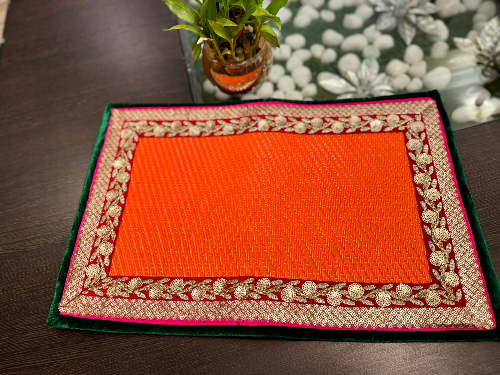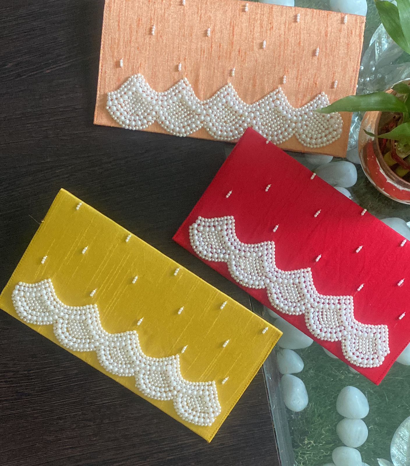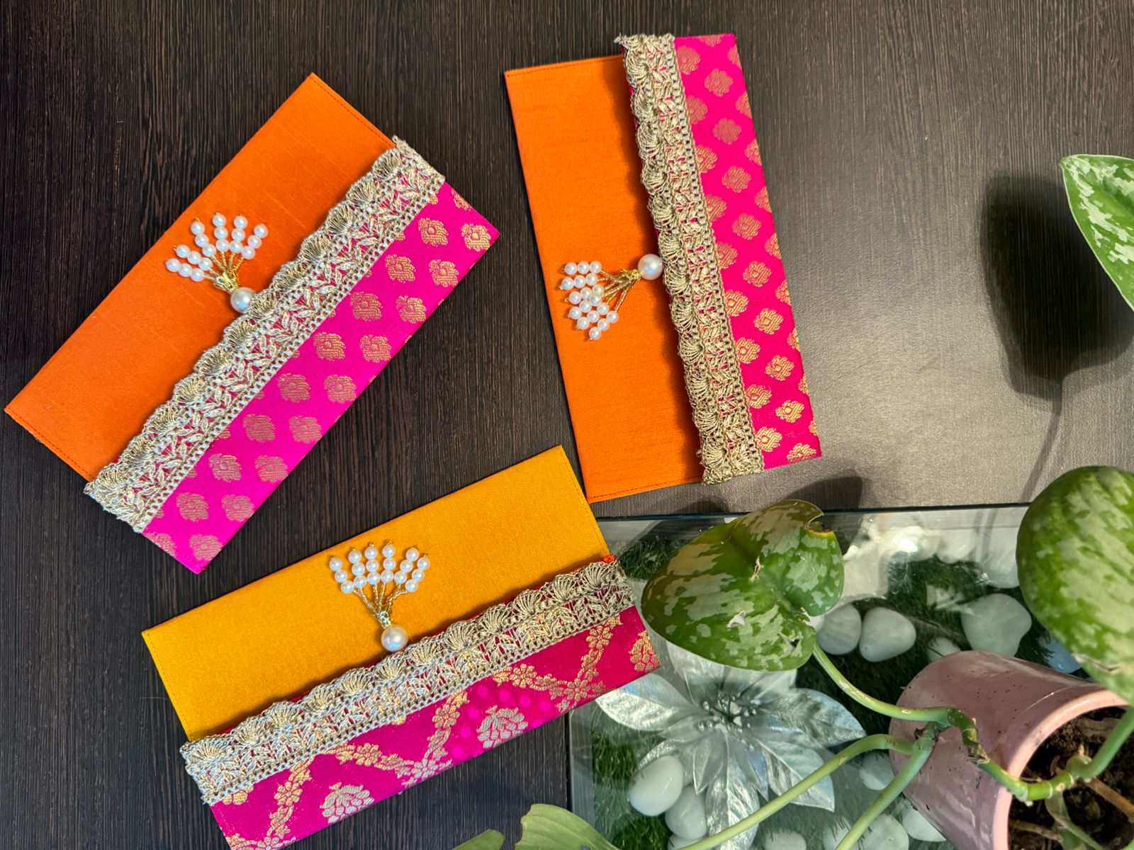 Majestic and traditional, this red silk envelope showcases an elaborate twin kairi embroidery design, symbolizing love and grace. Crafted with fine zari work and bead embellishments, it is the perfect envelope to present blessings at weddings, engagements, and religious ceremonies.